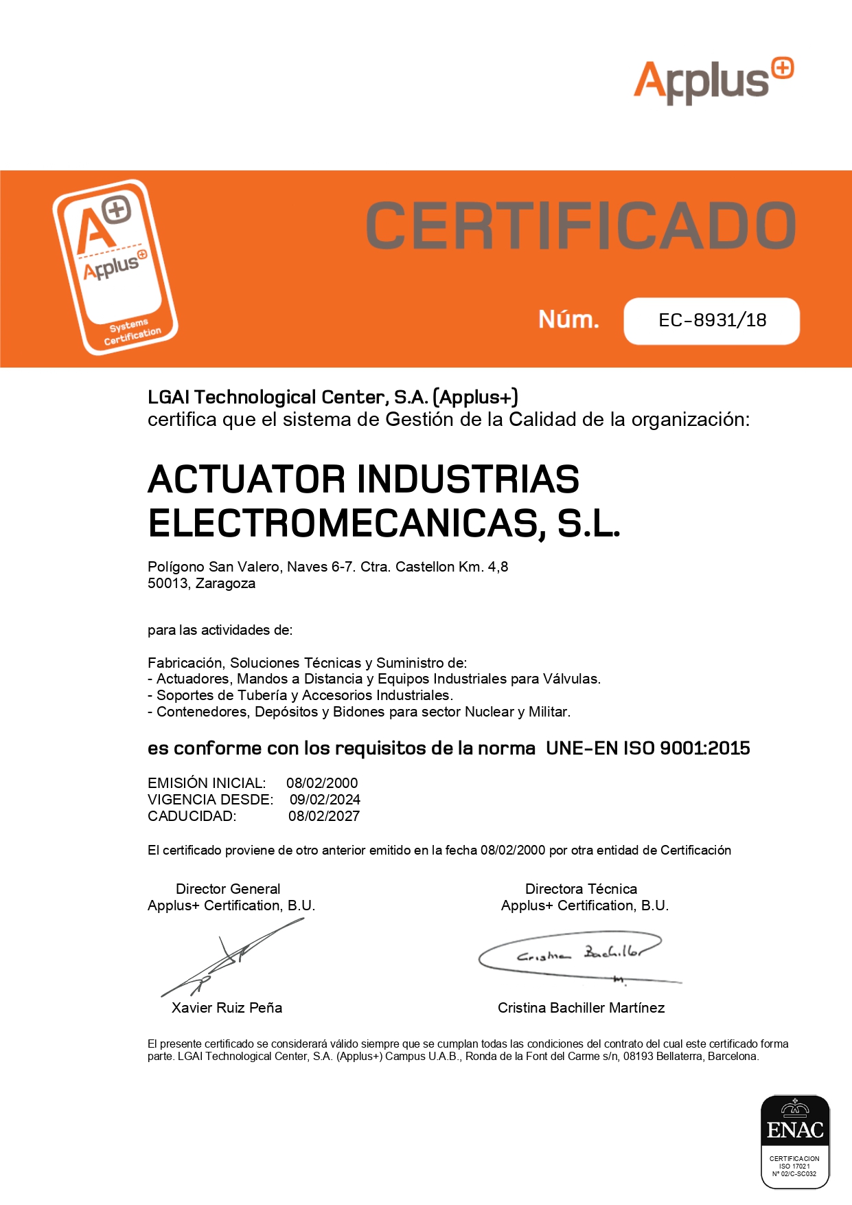Telephone: +34 976 500 552 Email: actuator@actuator.es Address: Polígono Industrial San Valero n. 6-7. Ctra. Castellón, Km 4,8. 50013. Zaragoza (Spain)