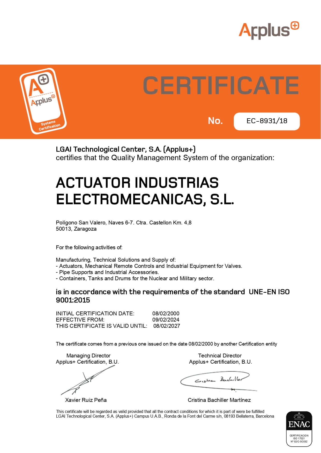 Telephone: +34 976 500 552 Email: actuator@actuator.es Address: Polígono Industrial San Valero n. 6-7. Ctra. Castellón, Km 4,8. 50013. Zaragoza (Spain)Fax: +34 976 500 551